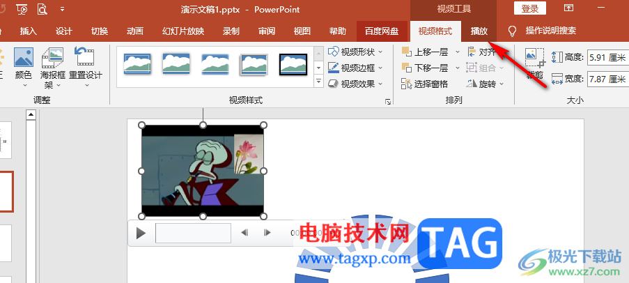 4、第四步,插入视频之后,我们在页面上方的工具栏中打开“播放”工具