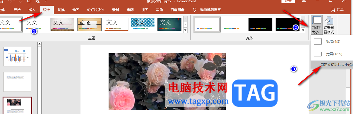2、第二步,进入PPT页面之后,我们在“设计”的子工具栏中打开“幻灯片大小”工具,然后在下拉列表中点击打开“自定义幻灯片大小”选项