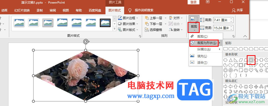5、第五步,最后我们在裁剪为形状的菜单列表中找到菱形形状,点击该形状就能得到菱形图片了