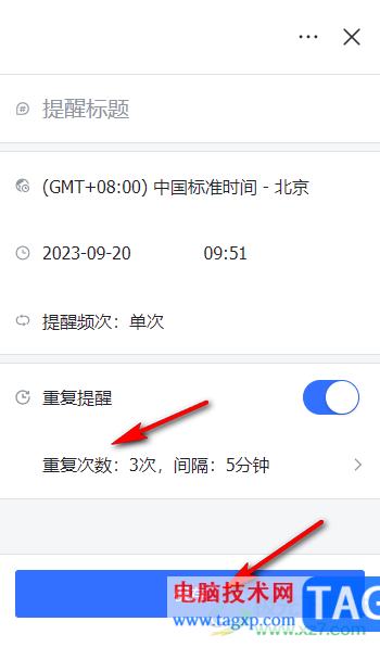 4、第四步,打开提醒设置窗格之后,我们先输入提醒标题,然后将“重复提醒”的开关按钮点击打开