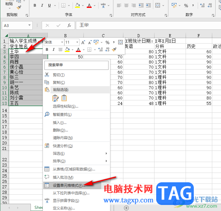 2、第二步,进入Excel页面之后,我们在该页面中选中所有名字,然后右键单击选择“设置单元格格式”选项