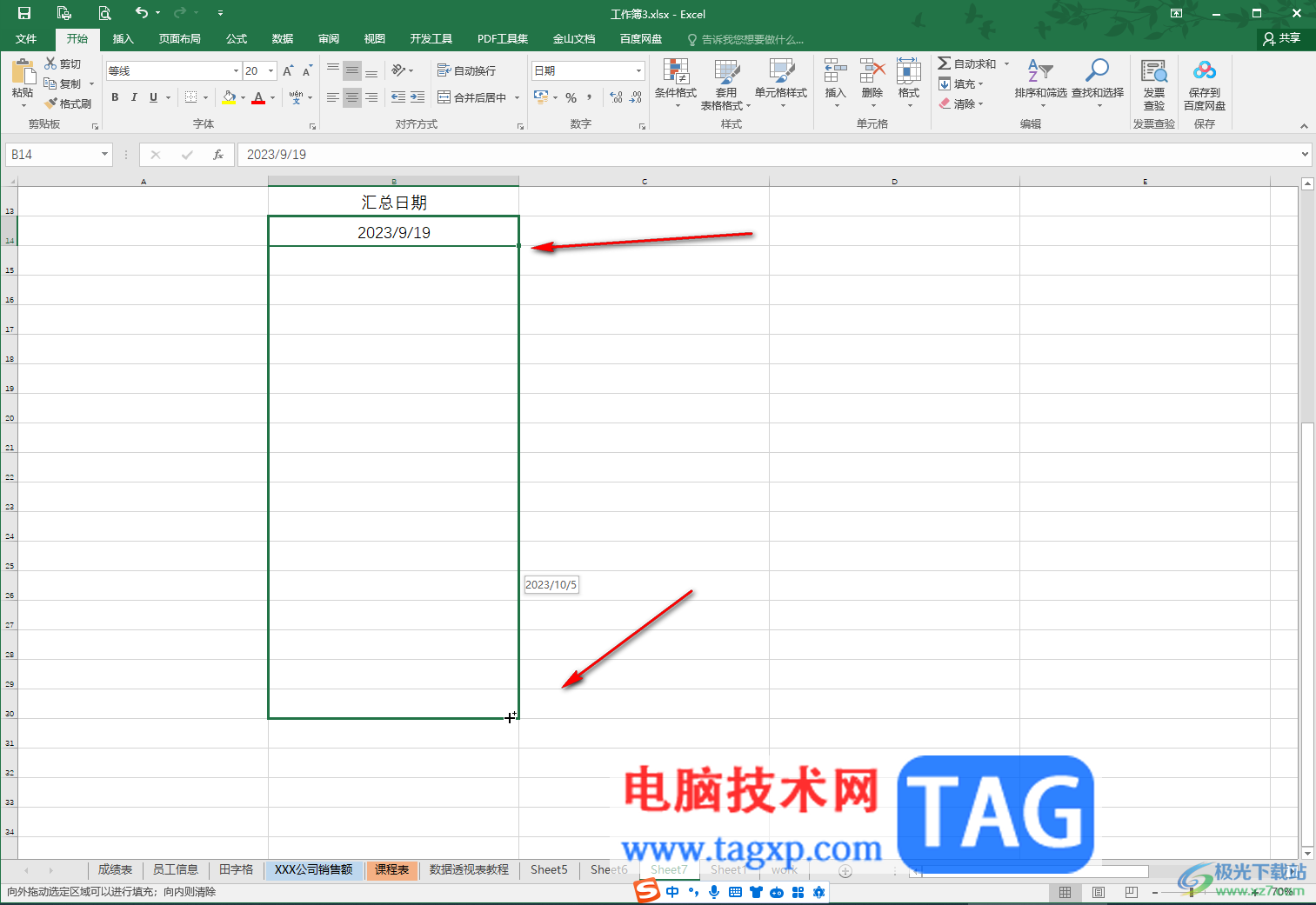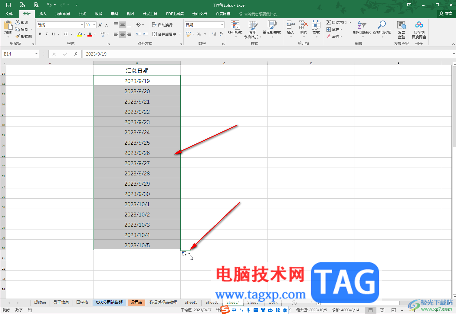 第二步:点击选中起始日期单元格,将鼠标悬停到右下角的小方块上,变成黑色实心加号时,向下拖动;