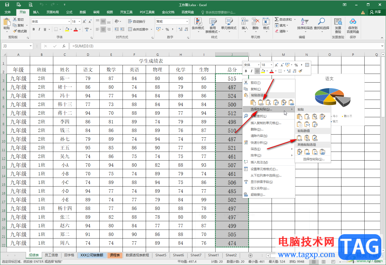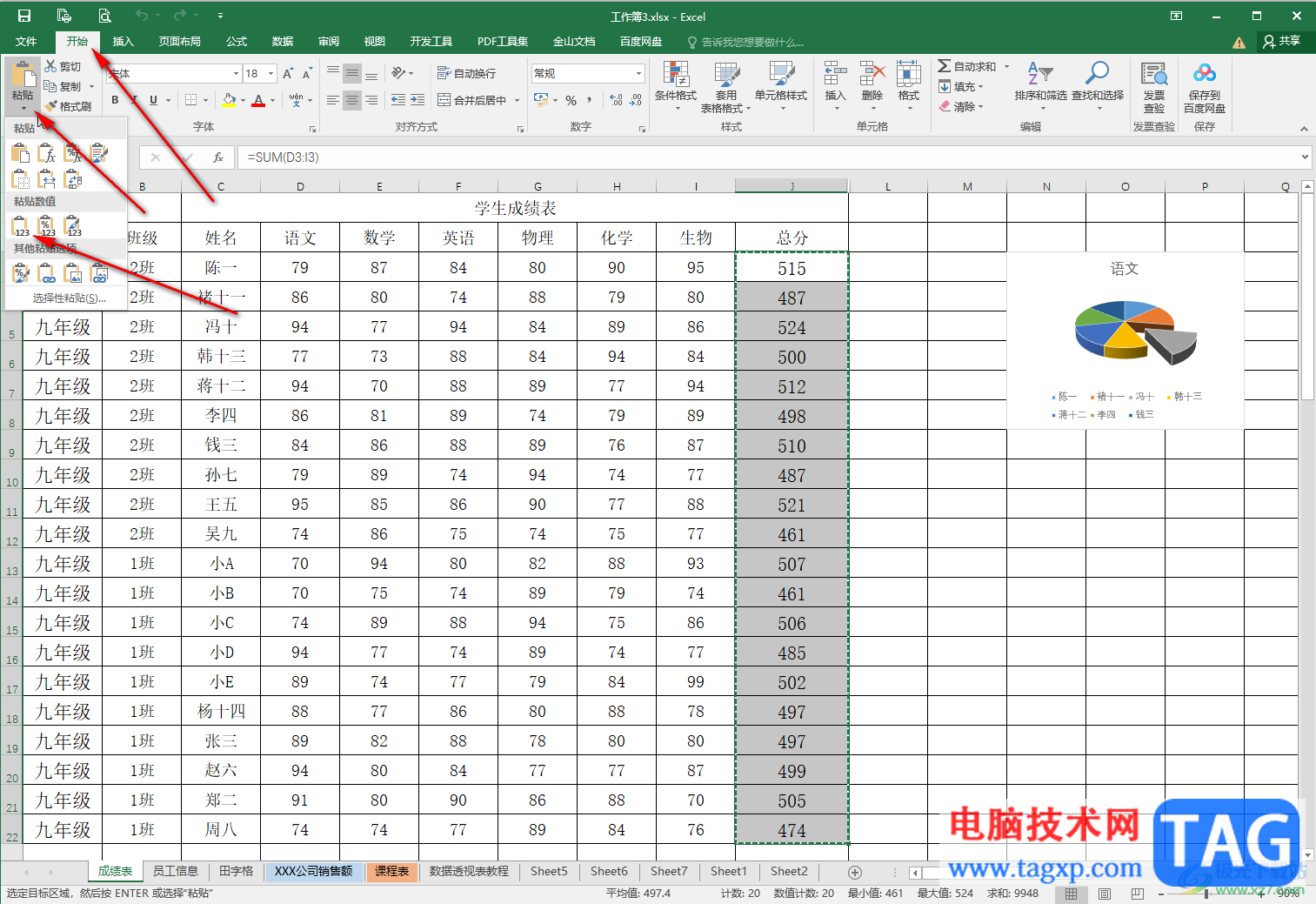 第一步:双击打开Excel表格,点击选中“总分”列的数据,可以在左上方编辑栏中看到使用了sum求和函数;