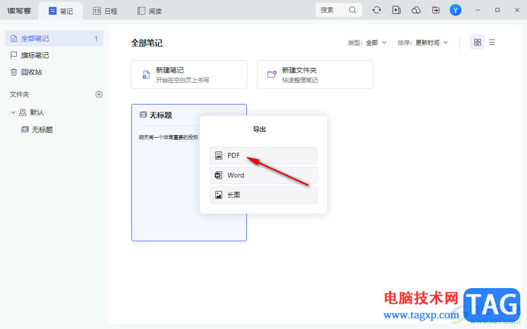 讯飞读写客是一款非常简单的笔记编辑软件,同时在该软件中提供的收藏网文的功能是该软件的一个亮点,此外,在讯飞读写客中还提供了可以进行各种文件的上传收藏的读写云等功能,一般在讯飞读写客中编辑的笔记内容是可以进行导出操作的,提供了三种导出的文件格式,你可以导出为word文档、PDF文件以及长图等,你只需要将要导出的笔记进行右键点击,即可选择导出的文件格式,下面小编给大家讲解一下如何使用讯飞读写客导出PDF文件的具体操作方法,如果你需要的情况下可以看看方法教程,希望对大家有所帮助。