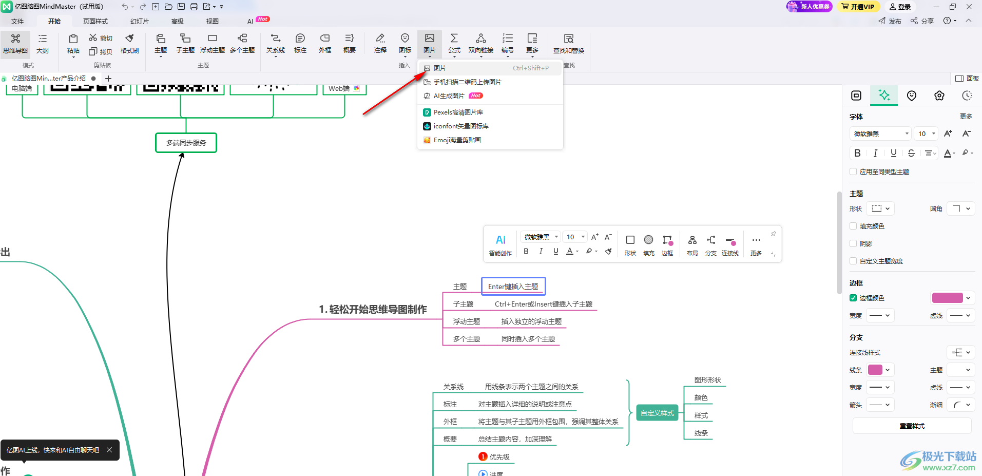 mindmaster是一款操作起来十分方便的脑图编辑工具,是一款可以在电脑上进行操作的软件,这款软件的编辑功能是非常全面的,其中我们可以在添加的子主题框中进行图片的插入使用,比如当你想要将其中某些图片进行添加进来表示,那么我们可以选中该主题框,然后在工具栏中找到图片功能,进入到本地中添加图片就可以了,也可以任意的修改添加进来的图片的大小,下方是关于如何使用mindmaster插入图片的具体操作方法,如果你需要的情况下可以看看方法教程,希望小编的方法教程对大家有所帮助。