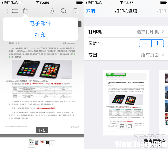 4. 屏幕上出现打印预览,以及打印机、份数和范围等选项。我们要做的就是在打印预览页面上按压,通过 3D Touch 的 POP 手势,将预览页面变为全屏预览。