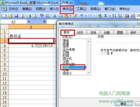 先点击选中那个单元格(注意:这里是单击一下选中单元格就行,不是双击两下成了光标输入模式了。),然后在菜单栏里选择;格式”-;单元格”命令,在弹出的对话框里选择;数字”标签,在;分类”一栏中选择;文本”,然后单击;确定” 。