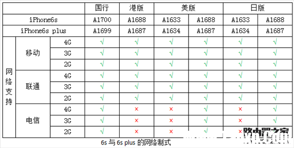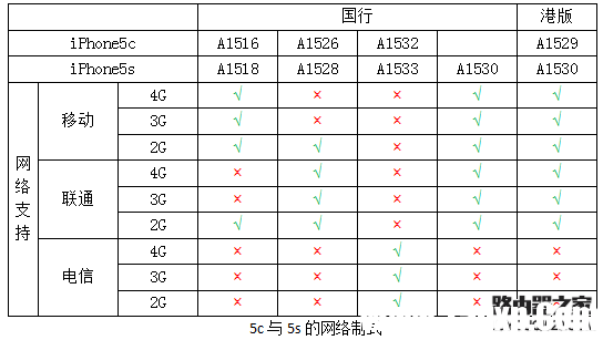 做完前面两步之后,就可以通过下面的表格来查找 iPhone 所支持的网络了。(现在市面上常见的 iPhone 6 及以上机型大部分都是国行、港行、美版和日版,所以我们这里只讨论这四个版本。5c 和 5s 以国行和港版居多,我们也主要针对这两个版本的对比。)