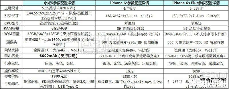 首先我们先来看看“小米5 与 iPhone6s 与 iPhone6s plus基本配置对比”如下图所示: