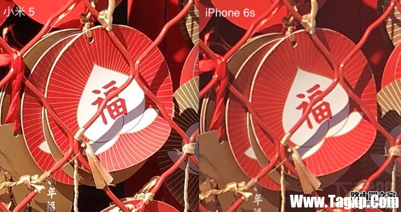 光照条件好的情况下,小米 5 的白平衡表现比较稳定,色彩饱和度稍高。由于像素上的优势,小米 5 拍摄出来的照片能够捕捉更多的细节,比如第二组对比样片,放大照片后,小米 5 拍摄的“福”字以及周边的线条明显更加锐利。