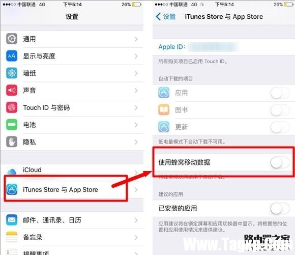 关闭方法:设置-App Store和iTunes Store,关闭“使用蜂窝移动数据”