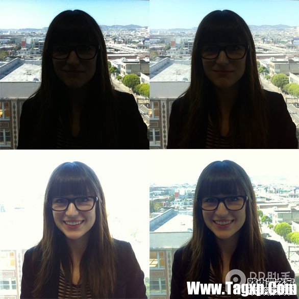 图中的四幅照片,左上为直接拍摄,右上为开启HDR拍摄,左下为触摸对焦至人物面部,右下则是触摸对焦后再开启HDR的结果。结果很明显,在遇到户外背光人像的拍摄状况时,我们应当首先将对焦点选择在人物面部,然后再使用HDR功能拍摄,让人物和背景都能有一个合适的曝光水平。