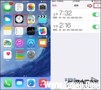1、点击进入iPhone6桌面的【时钟】,进入时钟后,切换到底部的【闹钟】,之后就可以看到闹钟设置了,如果需要添加闹钟,点击右上角的【+】。