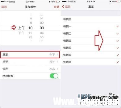 2、进入iPhone6闹钟添加界面,首先选好闹钟时间,然后再进入底部的【重复】,在这里面可以勾选闹钟周一到周日闹钟时间,比如需要设置周一到周六闹钟,那么勾选上着六个即可,大家可以根据自己的时间去选择(在左侧还可以对闹钟铃声、标签以及稍后提醒等进行设置)。