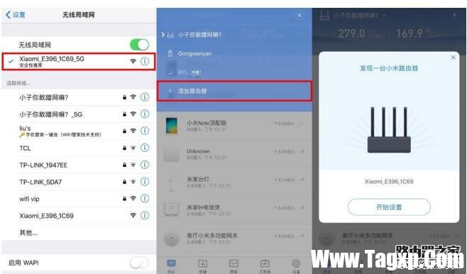 新的小米路由器HD通电后,等待路由器指示灯黄灯常亮时,用手机连接路由器发射的两个初始无密码的wifi信号,连接完成后进入小米wifi的app点击添加路由器选项,等待app发现未绑定的小米路由器HD,点击开始设置进入下一步。