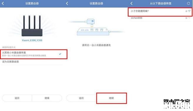 这时需要设置全新的小米路由器HD,选择设置的方式为“从其他小米路由器恢复”(也就是一键换机的功能),进入下一步后要确认旧小米路由器处于通电状态后,系统将自动搜索到旧小米路由器的wifi信号,选择需要转移数据的wifi信号就可以进入下一步了。