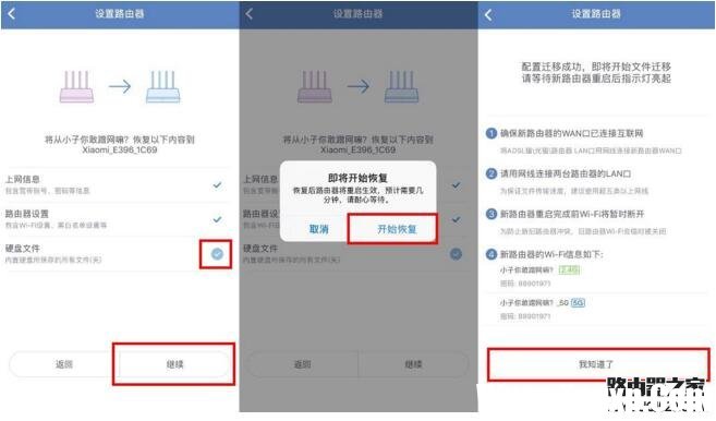 当系统分别连接新旧两台设备后,需要选择新小米路由器HD需要恢复的数据,其中上网的信息和路由器的基础设置为必选项,硬盘内的文件可以自由选择是否需要恢复,选择完成后点击继续,确认开始恢复就可以了,在数据迁移前系统需要人工完成对路由器的一些必要设置。