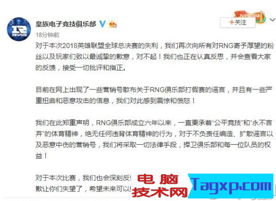 我们在此郑重声明,RNG俱乐部成立六年以来,一直秉承着“公平竞技”和“永不言弃”的体育精神,绝无任何违背体育精神的行为,对于不负责任编造、扩散谣言以及恶意中伤的营销号,我们将采取一切法律手段,捍卫俱乐部和每一位队员的权益!