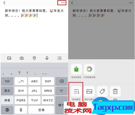 点击文字可以直接进入编辑界面,如果需要取消置顶或者删除,点击右上角的【...】菜单,在底部就可以看到“取消置顶”以及“删除”选项了。