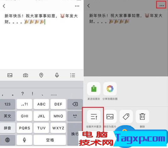 编辑输入文字(支持表情图片),然后点击右上角的【...】菜单,弹出选项,点击【在聊天中置顶】,如图,
