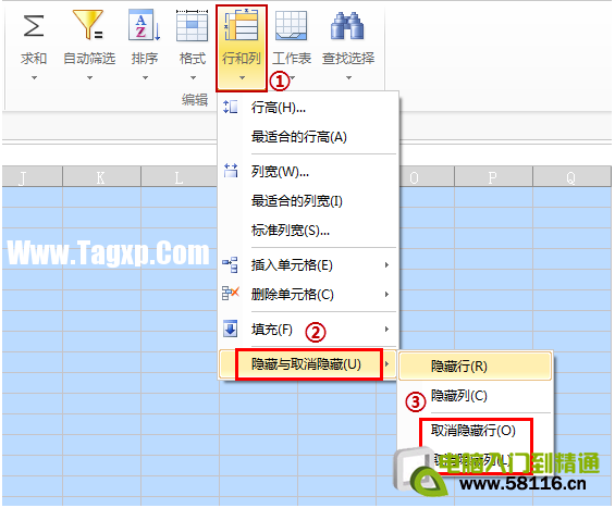 - 6、在表格中,全选表格并设置隐藏后,如何取消隐藏? 答:在菜单栏【开始】选项中的【行和列】→【隐藏与取消隐藏】中先后点击【取消隐藏行】、【取消隐藏列】即可,如下图所示: