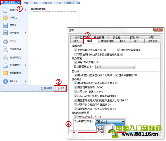- 2、从其他地方复制粘贴的内容,总会带有各种格式,每次粘贴都要单击鼠标右键,然后再选择;选择性粘贴”……这个操作太麻烦了! 答:可以设置默认的粘贴方式,步骤:点击WPS左上角的;WPS文字”按钮,在;选项”中的;编辑”栏中即可设置默认的粘贴方式。