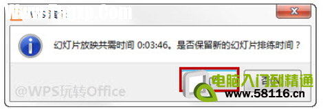 排练完成后(也就是PPT放映完成后),会弹出一个提示框,提示是否要保留新的幻灯片排练时间,点击;是”按钮即可(如下图:),此时,播放幻灯片就会是按预先排练的进行自动切换的播放,而不再需要手动操作来切换了。